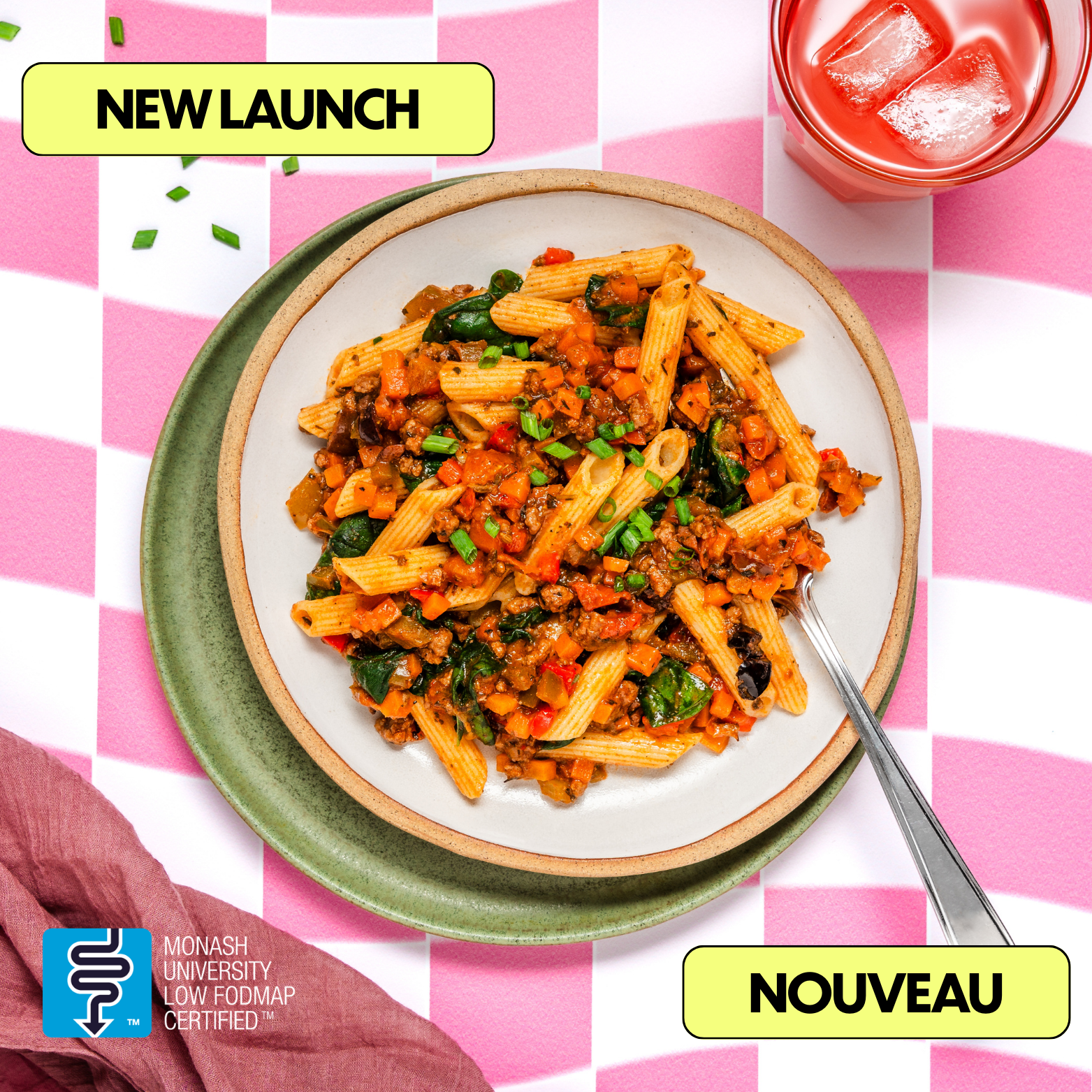 Gluten-free penne made from brown rice, tossed in a rich tomato sauce with seasoned minced beef and vibrant veggies. Oregano, thyme, and briny olives bring that classic Tuscan savoury-herb flavour. Hearty enough to satisfy, balanced enough to feel good after.